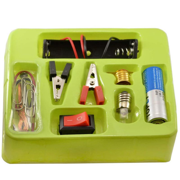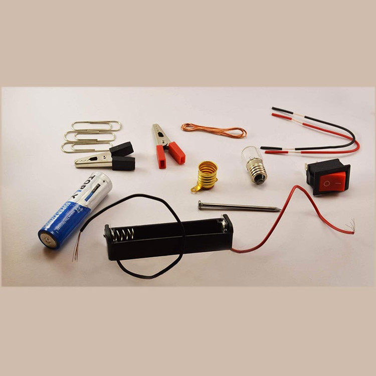 - اقلام داخل بسته:باتری قلمی، جای باتری قلمی، سیم، سرپیچ، لامپ، گیره، میخ آهنی، کلید قطع و وصل