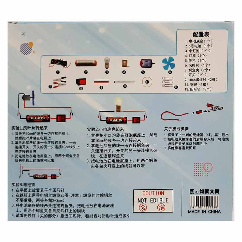 - اقلام بسته:1 عدد لامپ، 1 عدد سرپیچ، 1 باتری، 2 عدد گیره سوسماری، 1 عدد کلید قطع وصل، 1 عدد آرمیچر، 1 عدد پروانه، مقداری سیم و میخ و گیره کاغذ
