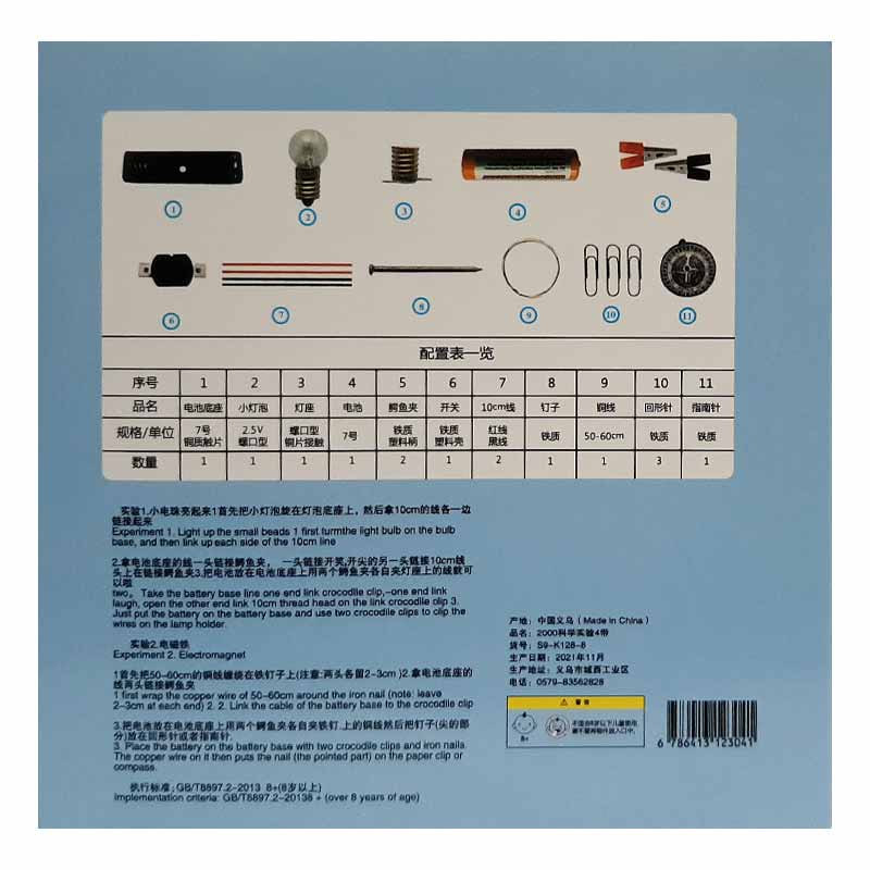 - اقلام بسته:2 عدد لامپ، 2 عدد سرپیچ، 1 باتری، 2 عدد گیره سوسماری، 1 عدد کلید قطع وصل، 1 عدد قطب نما، مقداری سیم و میخ و گیره کاغذ