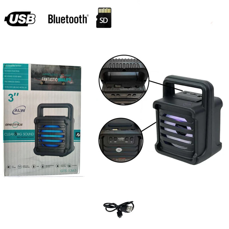 اسپیکر بلوتوثی قابل حمل مدل GTS-1363 اسپیکر پرتابل GTS-1363 را می توان به شکل ایستاده به کار برد و علاوه بر بلوتوث، با کارت حافظه، فلش مموری سازگاری دارد و همچنین و جود یک ساب 3 اینچی باعث شده است تا بتوانید ازقدرت صدای شگفت انگیزبهره ببرید.اسپیکر بلوتوث مدل GTS-1363 سری FANTASTIC با کیفت عالی و ورودی TF،USB که صدایی با کیفیت در اختیار کاربر قرار می دهد. رقص نور ویژگی شگفت انگیز دیگر این اسپیکر، وجود رقص نوررنگی در هنگام پخش موزیک است.که باعث زیبا تر شدن فضا میشود و لذت گوش دادن به موسیقی را چند برابر میکند - قابلیت ویژه دیگر اسپیکر GTS-1363وجود فناوری TWS یا همان اتصال همزمان دو دستگاه با مدل یکسان برای قدرت صدای بیشتر می باشد. برای اتصال همزمان دو دستگاه به گوشی موبایلتان کافی ست دکمه M برای چند ثانیه نگه دارید تا ارتباط برقرار شود. - نحوه ی اتصال به صورت بی سیم توسط بلوتوث با محدوده ی عملکرد 10 متر بدون مانع ، با پشتیبانی از فلش مموری (USB) و رم میکرو SD جهت پخش موسیقی - حداکثر حجم حافظه قابل پشتیبانی 32 گیگابایت، پاسخ فرکانسی در محدوده ی 100 هرتز الی 20 کیلوهرتز به منظور پوشش صداهای زیر و بم - باتری درایورهای داخلی این بلندگو بی سیم، قدرتی برابر 10 وات برای آن رقم می زنند و با هر بار شارژ کامل باتری 800 میلی آمپر ساعتی آن امکان 2 ساعت پخش مداوم موزیک با ولوم 50% در اختیارتان خواهد بود. - رادیو از ویژگی های دیگر اسپیکر وایرلس جی تی اس مدل GTS-1363می توان به رادیوی FM، برد 10 متری و پخش صدای استریو اشاره کرد. - جنس بدنه از پلاستیک با کیفیت، دارای دسته جهت حمل آسان و مناسب - دارای کلیدهای فیزیکی جهت روشن و خاموش کردن، مدیریت موسیقی و … - امکان شارژ مجدد دستگاه توسط پورت MicroUSB و کابل همراه