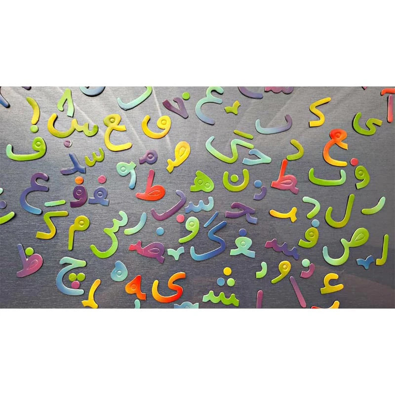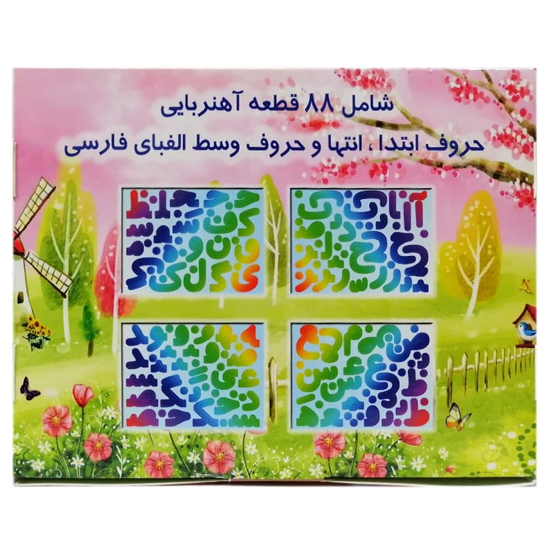 اقلام داخل بسته: ۸۸ قطعه آهنربایی حروف ابتدا، انتها و حروف وسط و سه سری اعداد و علائم فارسی