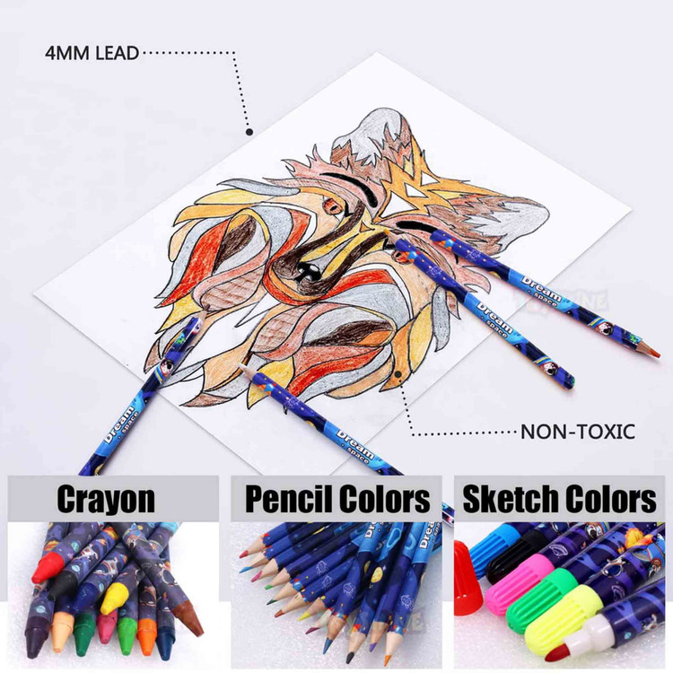این پک شامل: ۶ عدد ماژیک - ۱۲ عدد پاستل - ۱۲ عدد مداد رنگی - ۶ عدد مداد مشکی - جامدادی فلزی - دفتر نقاشی ۴۰ برگ - پاکن - تراش - خط کش