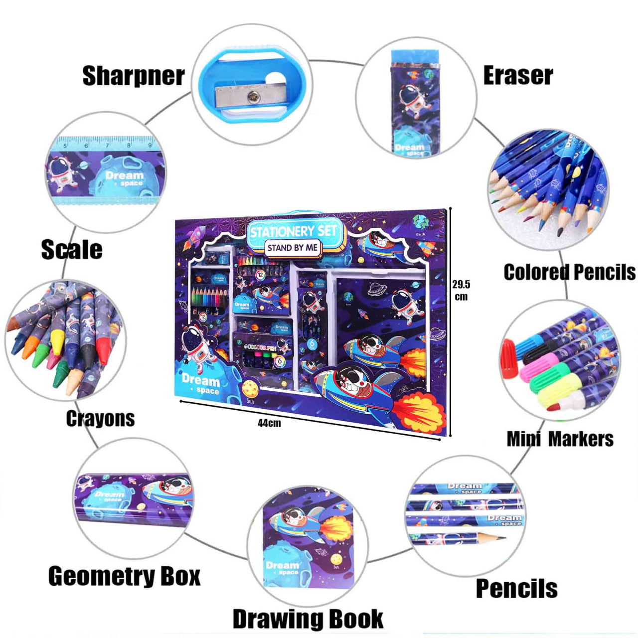 این پک شامل: ۶ عدد ماژیک - ۱۲ عدد پاستل - ۱۲ عدد مداد رنگی - ۶ عدد مداد مشکی - جامدادی فلزی - دفتر نقاشی ۴۰ برگ - پاکن - تراش - خط کش