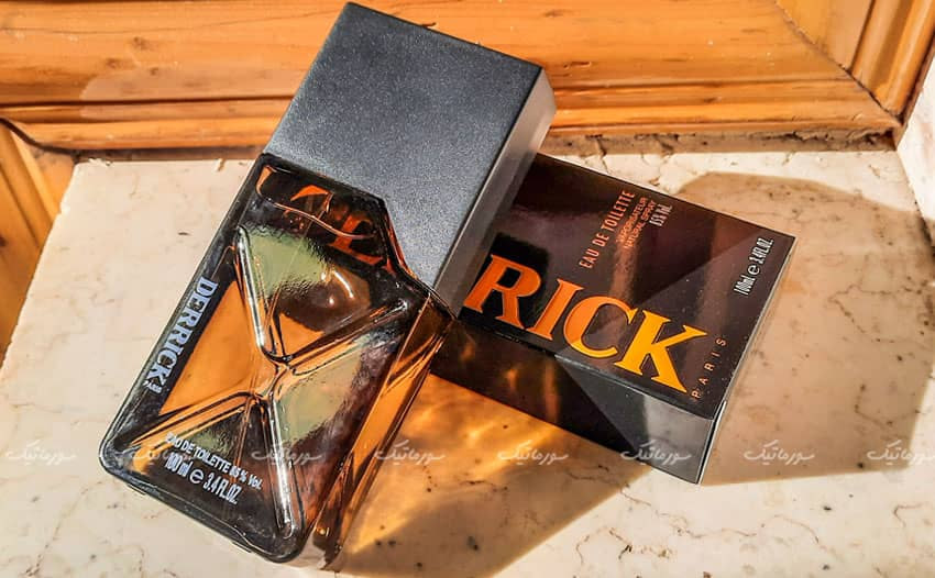 اگر به بطری این عطر تند و تیز نگاه دقیقی بیندازید، متوجه طراحی مردانه و محکم آن خواهید شد. روی شیشه، دو خط مورب به شکل ضربدری حک شده است که جدیت و استحکام Derrick را نشان میدهد. مایع طلاییرنگ درون بطری از روی شیشهی تیره و دودی آن به خوبی دیده میشود.