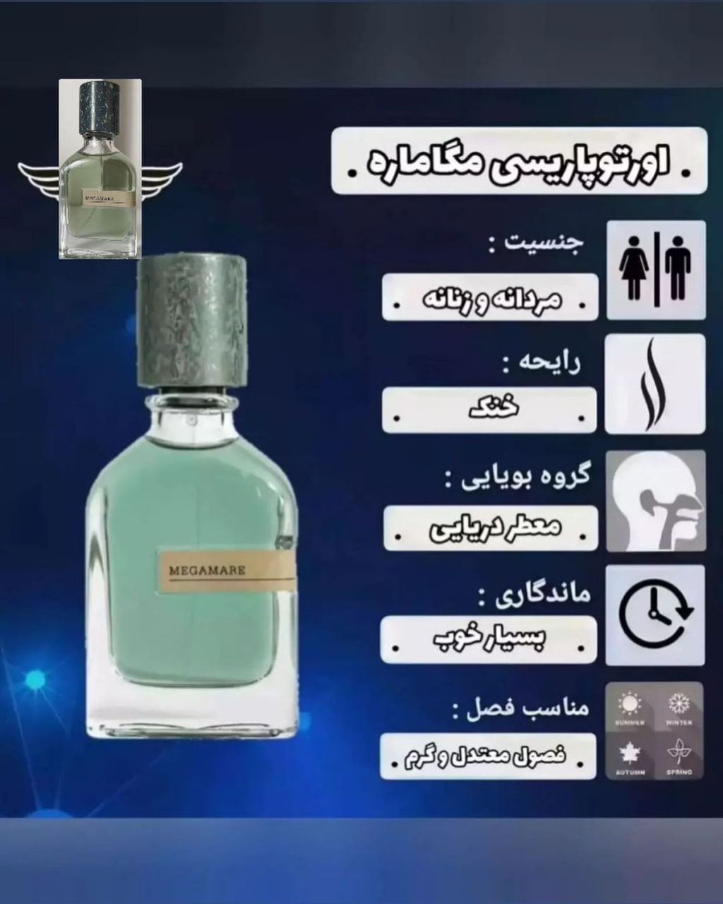 خوش پوشترین و پرفروشترین عطر نیش سالهای اخیر همین عطر مگامار (مگاماره) اثر دیوانه عطرسازی یعنی آلساندرو گالتیری است. هرکجا از یک عطر عجیب یا رایحهای عجیب صحبت میشود، ما را یاد عطر ساز معروف آقای الکساندرو گوالتیری که خالق عطرهایی پیچیده و متفاوت است میاندازد. ادکلن مگاماره اورتو پاریسی با گروه بویایی دریایی آبزی و حجم پنجاه میل با غلظت پرفیوم در سال 2019 به بازار معرفی شد. نتهای دریایی احساسات درگیرکننده و احیاکننده را بیدار میکنند، حال و هوای عاشقانه ساطع میکنند و افرادی که آنها را نفس میکشند را شاد و سرحال میکند.